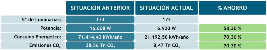 Las obras de renovación han consistido en sustituir 173 luminarias viales de 80W de Vapor de Mercurio por 150 luminarias Micro Urban de tecnología Led y 23 Faroles Tipo Villa y Fernandino. Esta mejora ha generado un ahorro energético de un 70,30%.